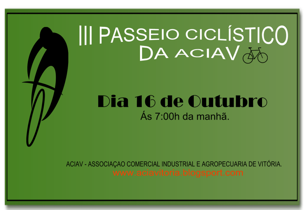 A Associação Comercial, Industrial e Agropecuária da Vitória de Santo Antão, estará realizando neste proximo dia 16 de outubro 2011, o terceiro Passeio Ciclístico da ACIAV. O evento está sendo realizado em comemoração ao dia do comerciário, as inscrições poderão ser feitas na sede da ACIAV. O início do evento está programado para ás 7h quando será servido um café da manhã para os participantes e em seguida será dada a partida do passeio ciclístico.